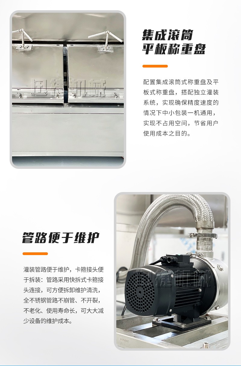 集成滾筒、平板稱(chēng)重盤(pán),一機(jī)多用,方便快捷:配置集成滾筒式稱(chēng)重盤(pán)及平板式稱(chēng)重盤(pán),搭配獨(dú)立灌裝系統(tǒng),實(shí)現(xiàn)確保精度速度的情況下中小包裝一機(jī)通用,實(shí)現(xiàn)不占用空間,節(jié)省用戶使用成本之目的。