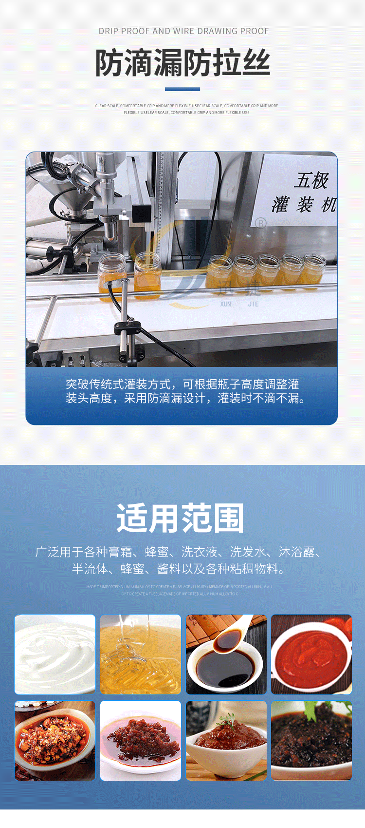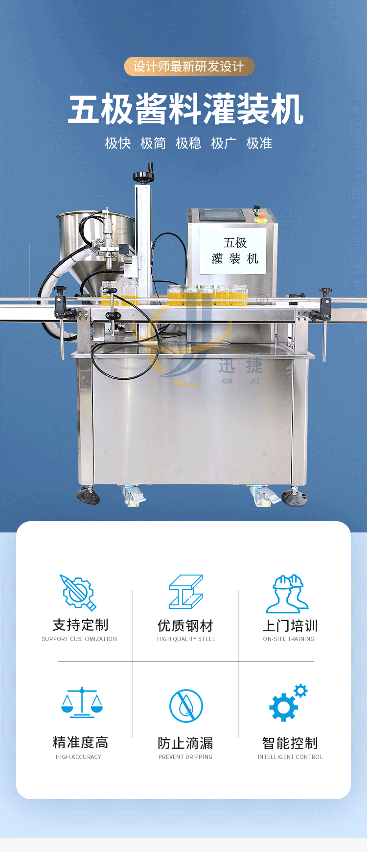 五極灌裝機(jī):極快-單頭2200瓶/時(shí) 極簡(jiǎn)-操作簡(jiǎn)單 極廣-啥啥都能灌 極穩(wěn)-24小時(shí)不停機(jī) 極準(zhǔn)-200g誤差小于1g。