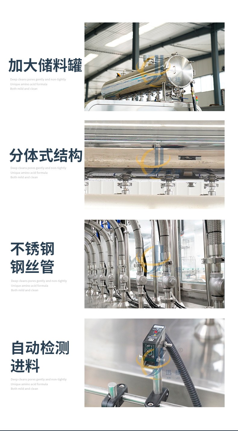 全自動液體灌裝機迅捷_01.jpg全自動液體灌裝機用于灌裝飲料、果汁,牛奶,酒精,消毒液,口服液,洗衣液等液體,廣泛應用于食品,化工,醫療等行業,灌裝精密,功能強,實用性高的灌裝機械。