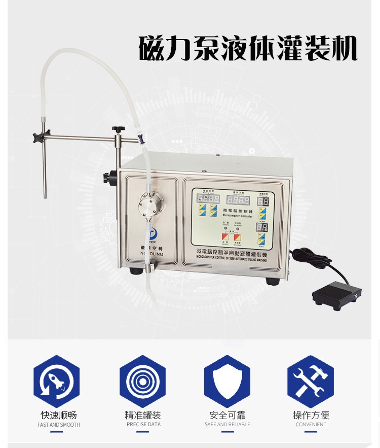 可灌充絕大類型的液體,包括高粘稠度的液體。如:各種藥劑、化學品、油類、化妝品、食品等無顆粒狀液體;灌裝精度高,適合實驗室用。